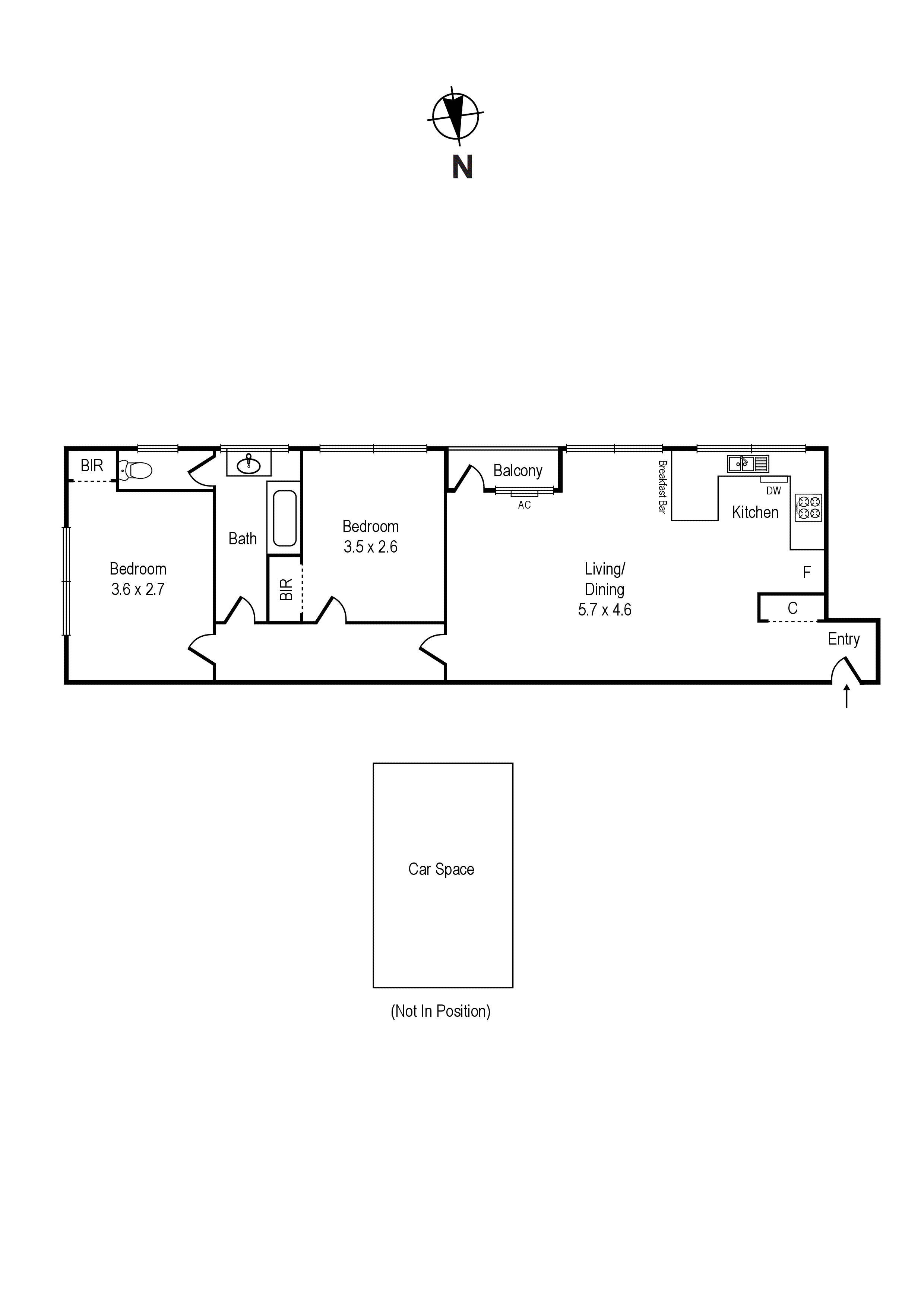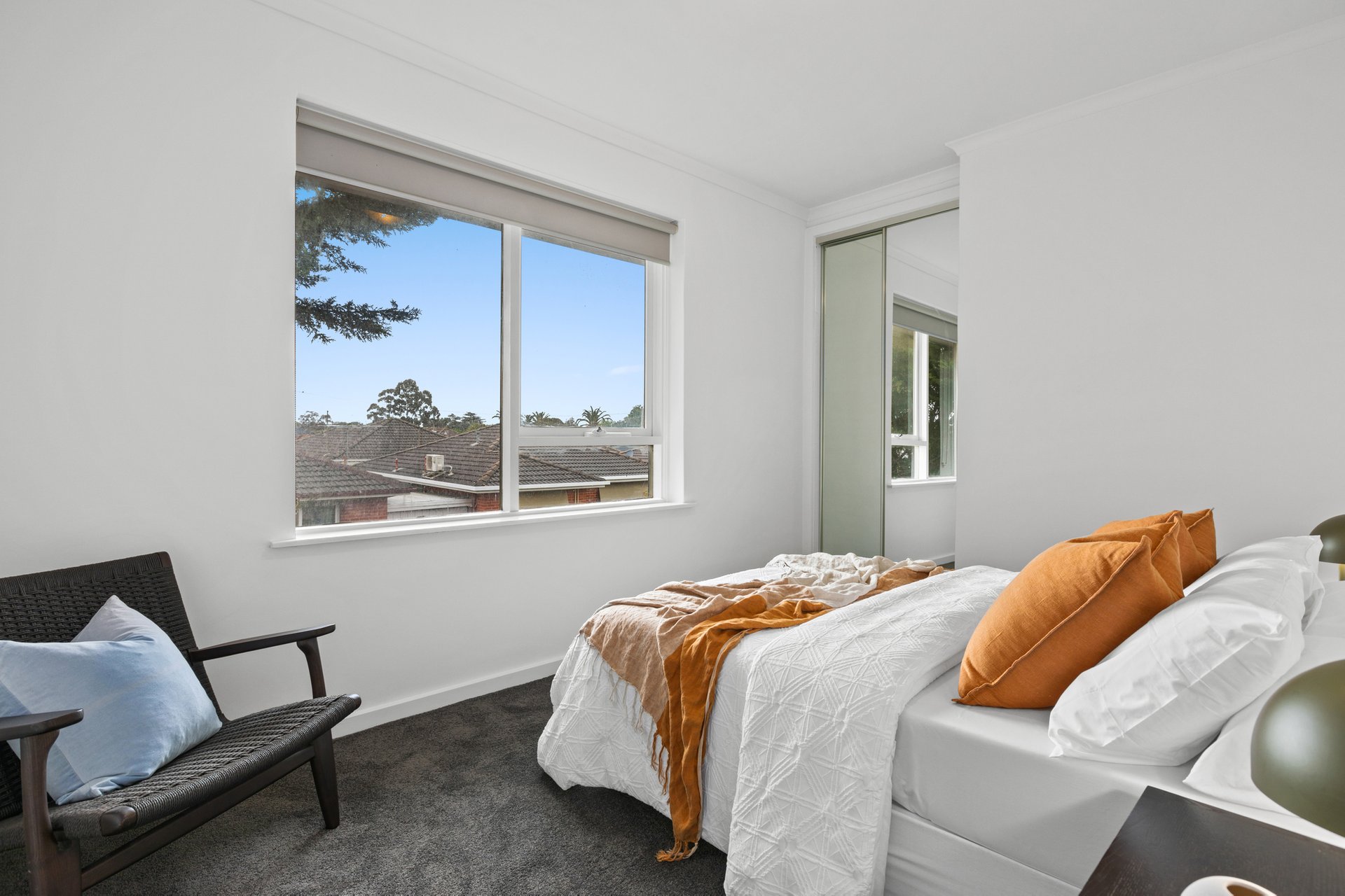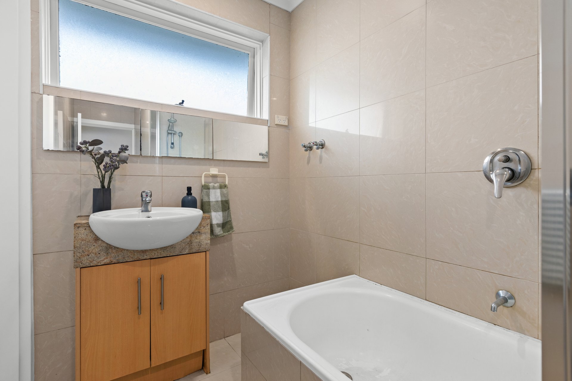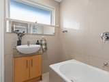Floor-to-ceiling tiles star in the combined bathroom/laundry, which includes a shower over a bath and a separate WC, while mirrored built-in wardrobes can be found in both of the carpeted bedrooms.