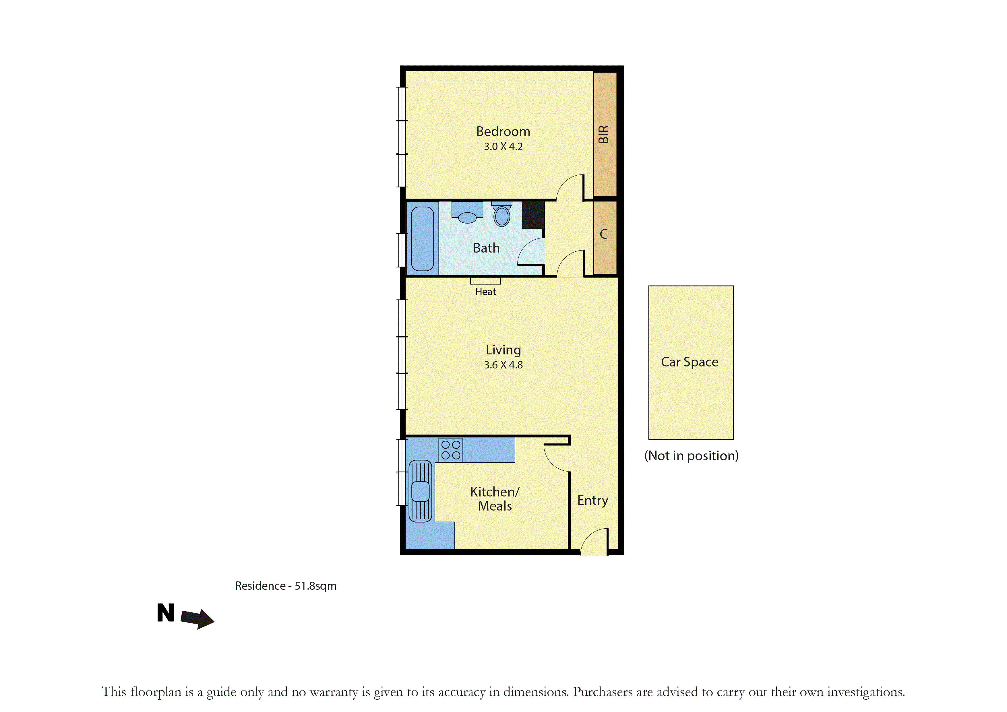 Double-glazed windows feature throughout, enhancing natural light while providing excellent thermal insulation and acoustic comfort — keeping the home warm in winter, cool in summer, and wonderfully quiet. The bedroom includes built-in robes, while the bathroom offers a shower-over-bath layout. Year-round comfort is assured with split-system air conditioning in both the living area and the bedroom, a rare advantage. Added benefits include a secure entrance, a dedicated undercover car space and visitors parking for guests.