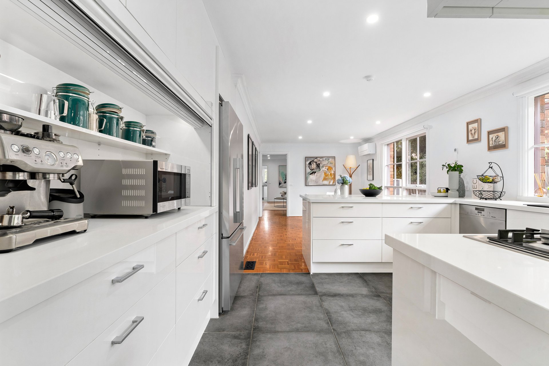 Supported by reverse cycle air conditioners throughout, evaporative cooling on the second floor this home comprises a sunny L shaped lounge and dining room as well as a family room that opens onto a delightful patio overlooking the gardens and alfresco dining. The joyful kitchen and meals room catches the morning light and is appointed with resilient stone and glass surfaces, gas cooking and a dishwasher.