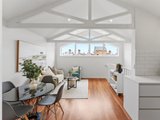 Upstairs, the home reveals generous living and dining areas enhanced by polished timber floors, exposed beams, and an elevated outlook that amplifies the sense of space. At the heart, the kitchen has been thoughtfully renovated, showcasing sleek stone benchtops, a Bosch dishwasher, Technika gas cooktop, and electric oven, all illuminated by a Velux sky window that brings natural light throughout the day.