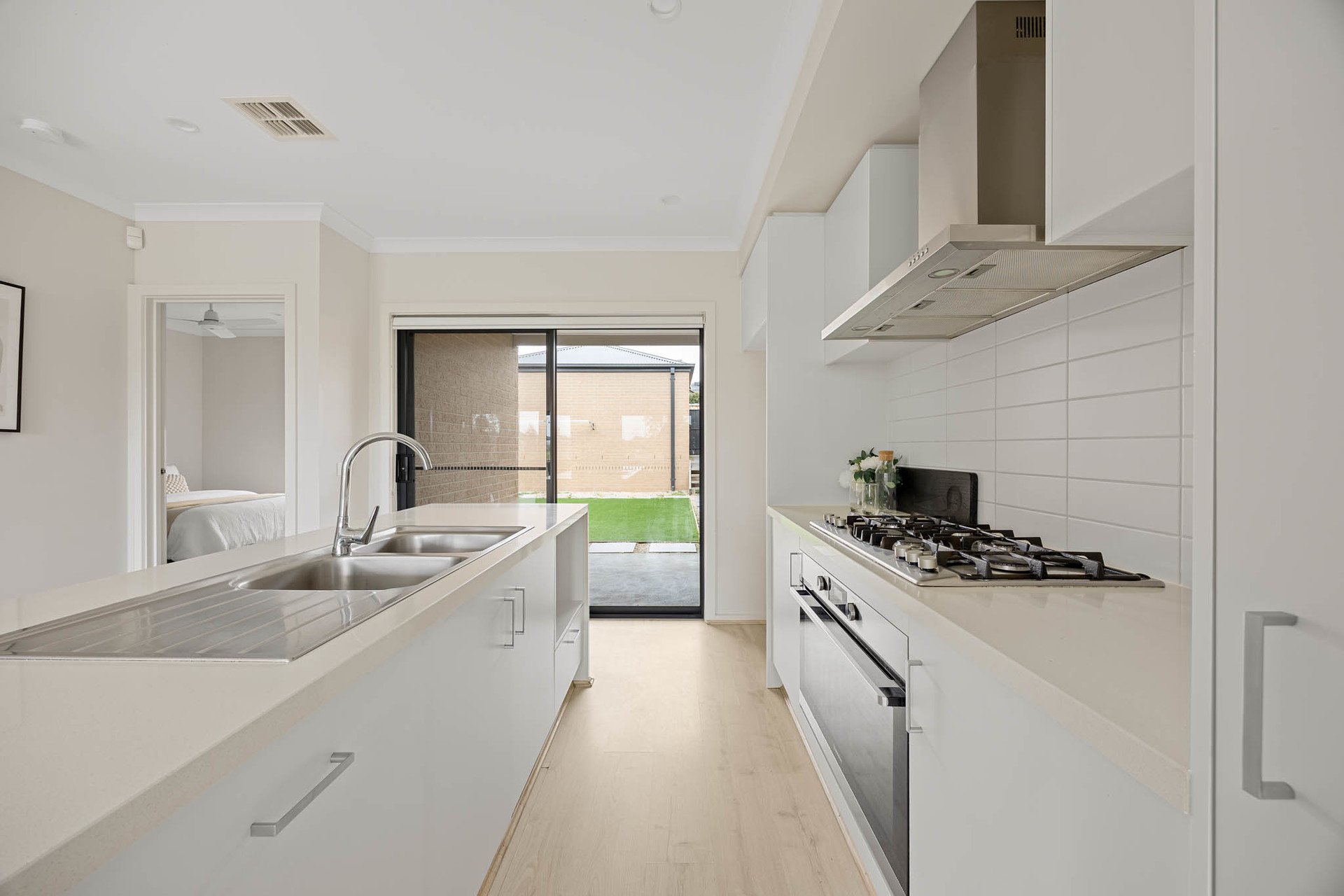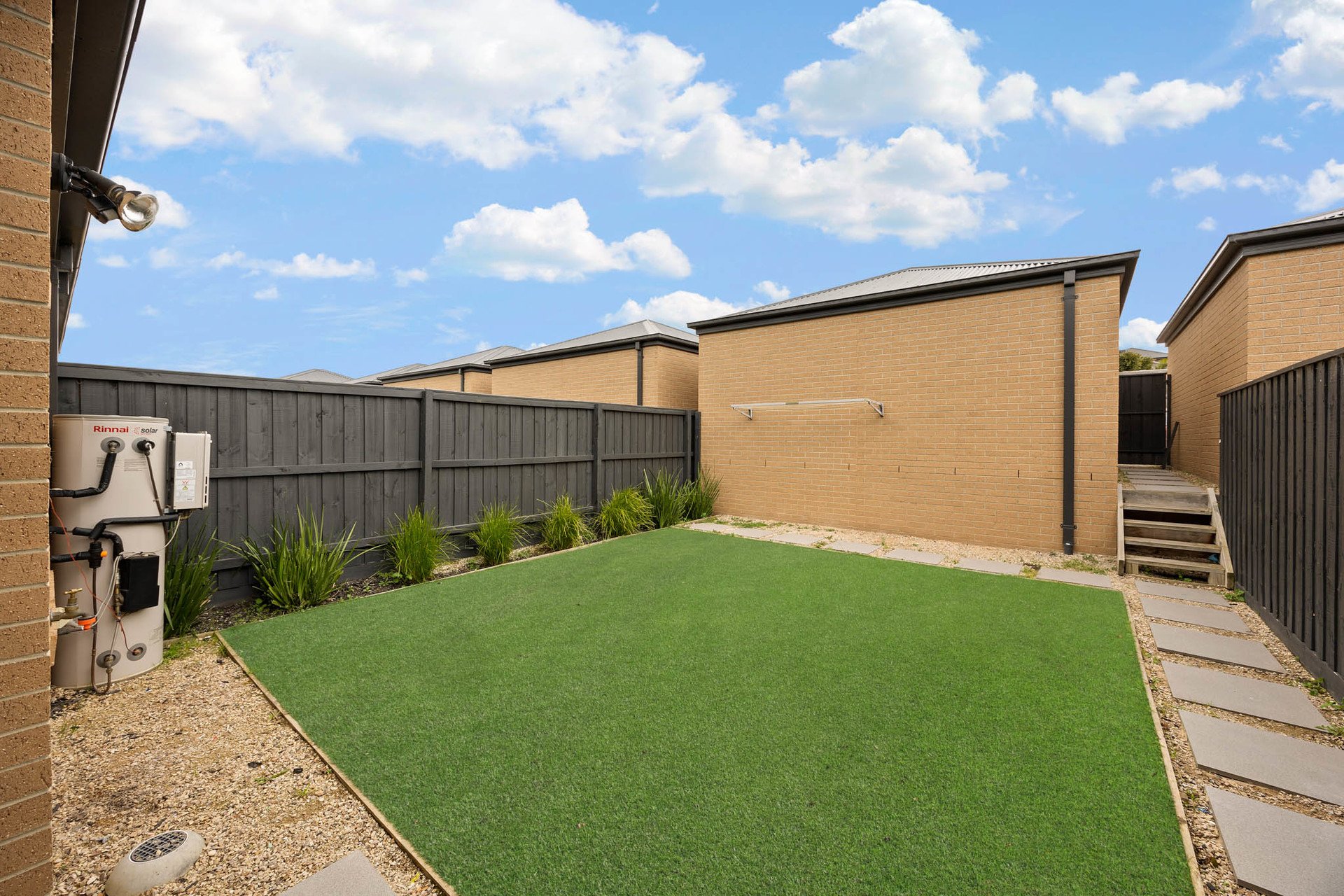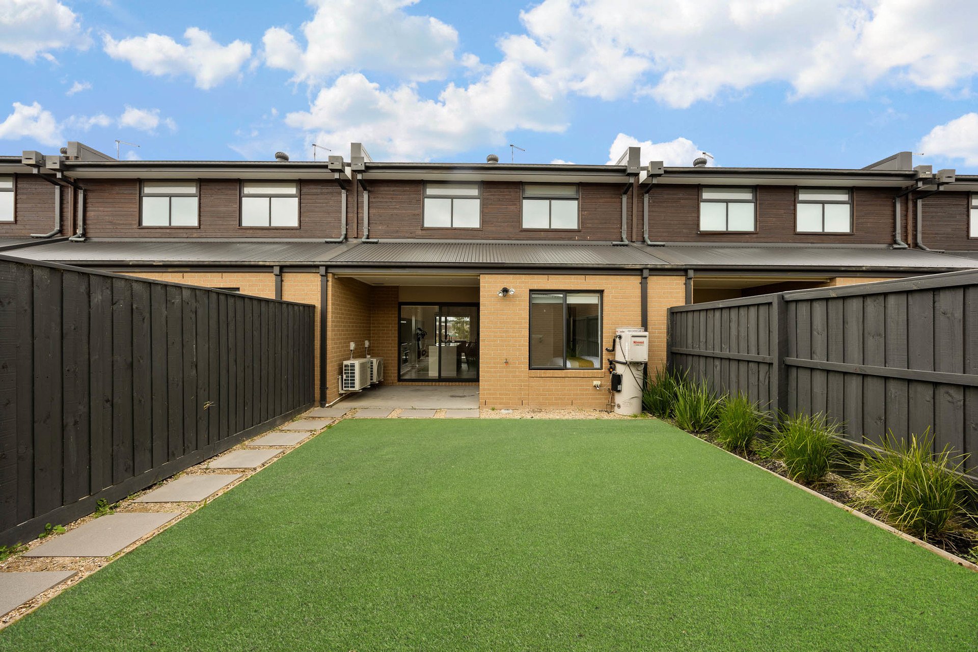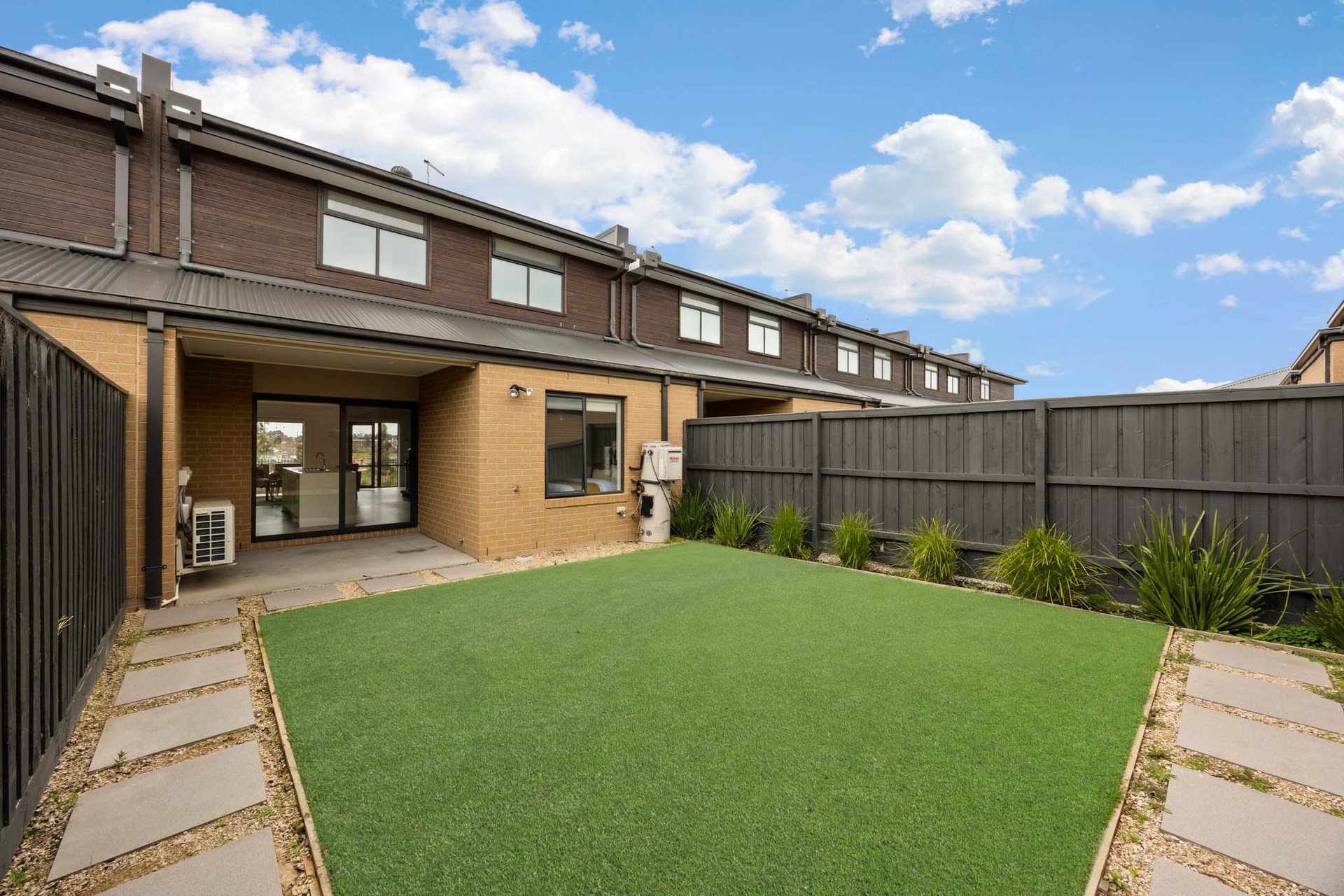 Outdoors, alfresco entertaining flows to a private courtyard garden with astro-turf and large-format paver pathways. Clever planning places one bedroom plus a dual-access bathroom to this level-ideal for guests or intergenerational living.