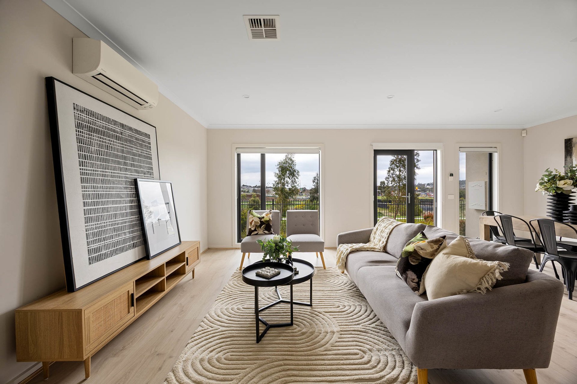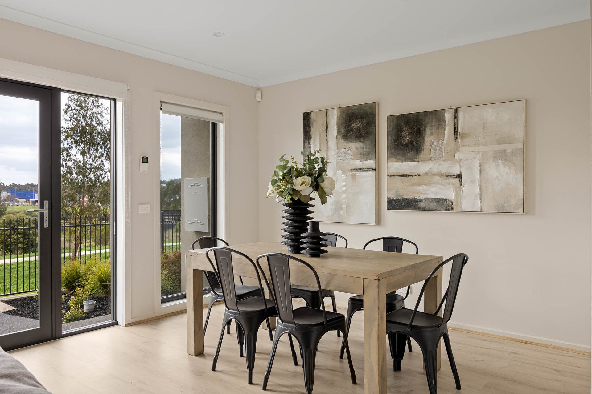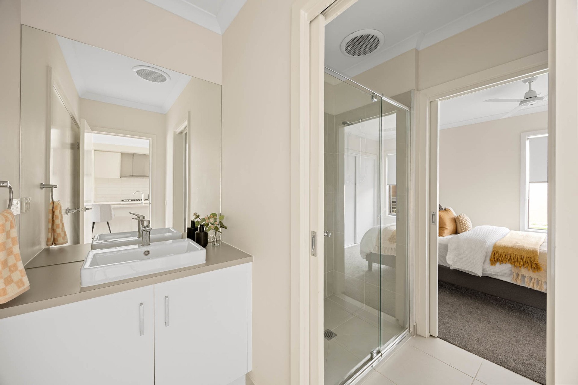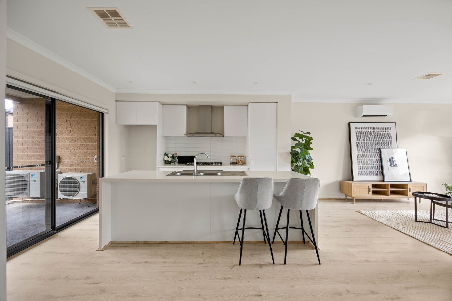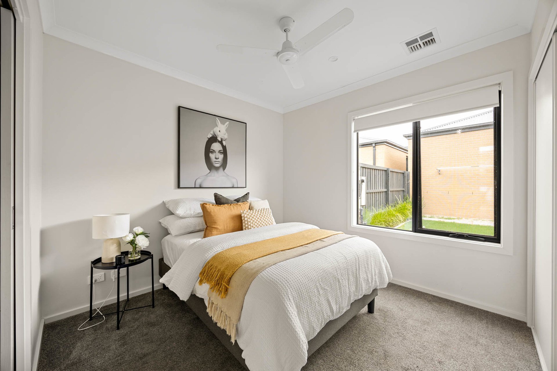 Outdoors, alfresco entertaining flows to a private courtyard garden with astro-turf and large-format paver pathways. Clever planning places one bedroom plus a dual-access bathroom to this level-ideal for guests or intergenerational living.
