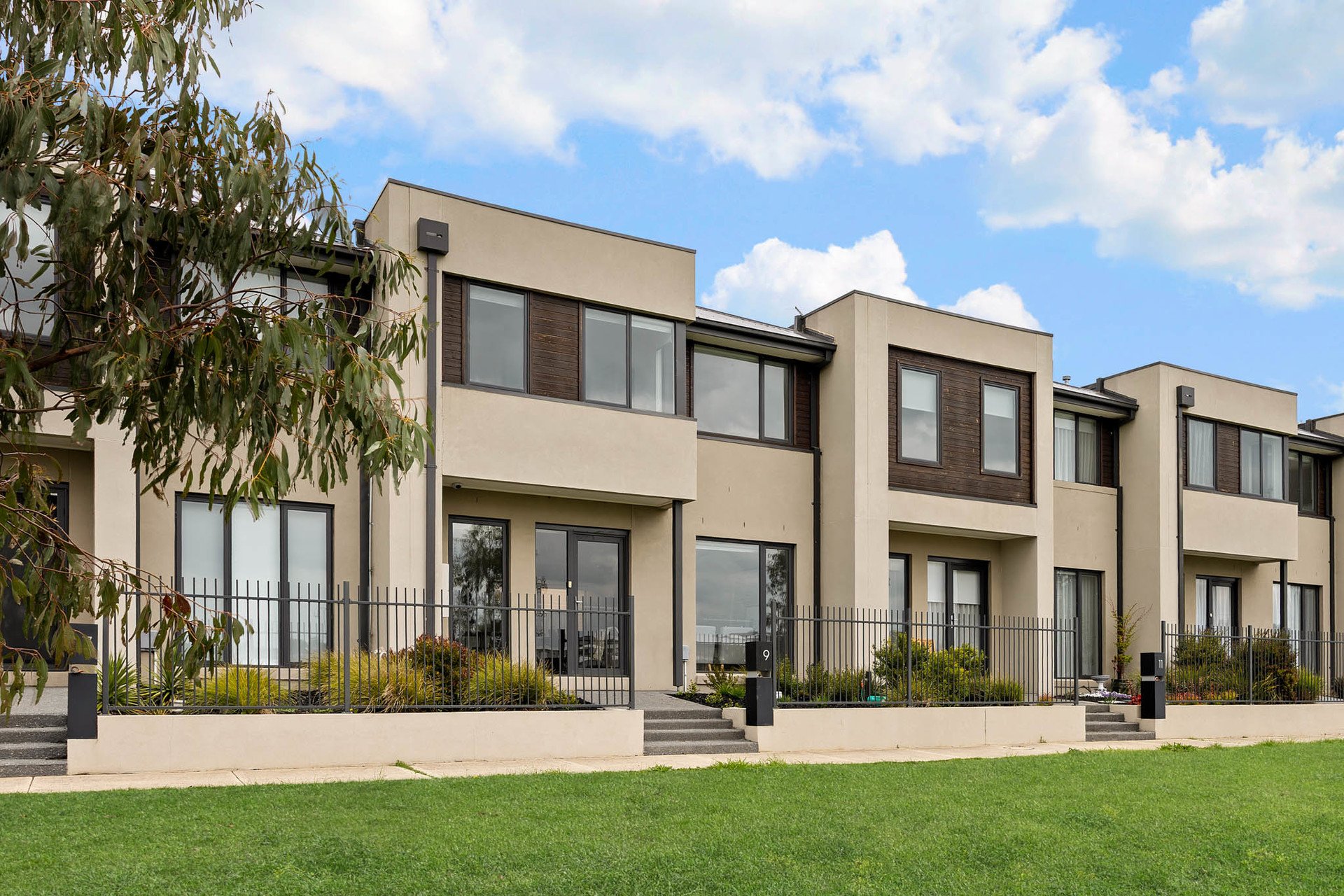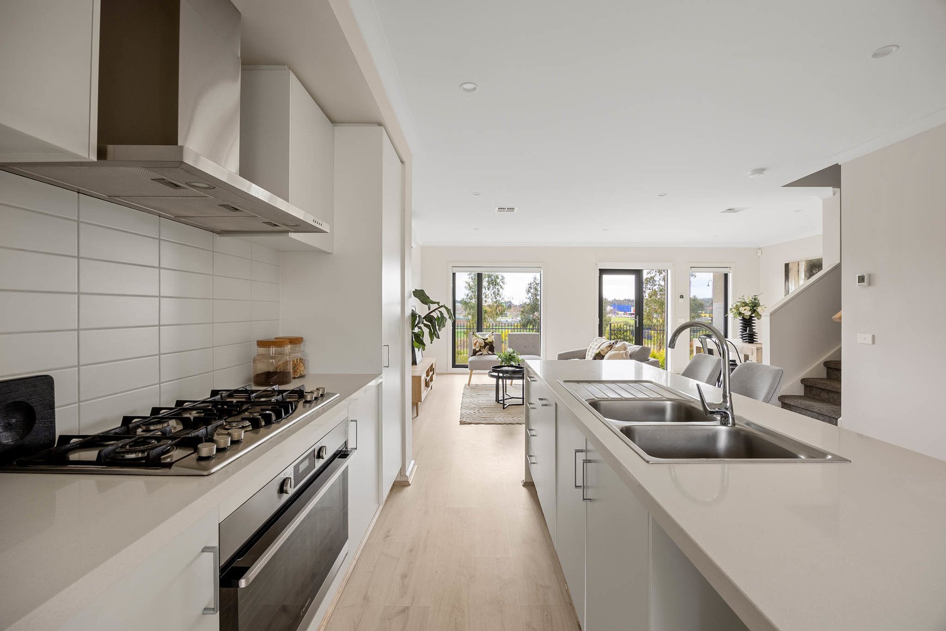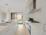 Introduced by a low-maintenance landscaped garden, interiors open to spacious open-plan living and dining zones, anchored by a sleek designer kitchen featuring a 40mm waterfall-edge stone island, a 900mm-wide oven, 6-zone cooktop, and an integrated dishwasher, with soft-close cabinetry completing its streamlined aesthetic.