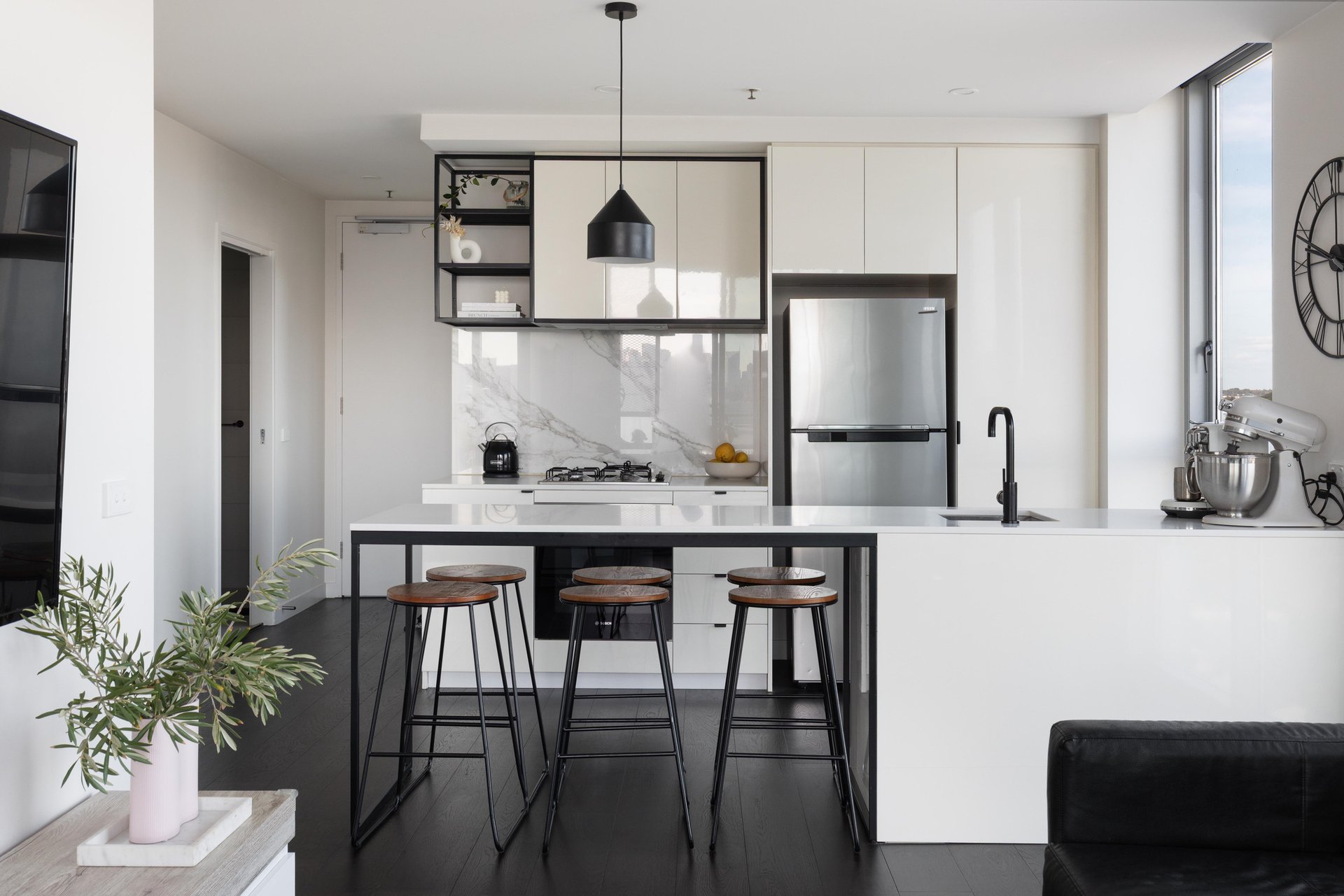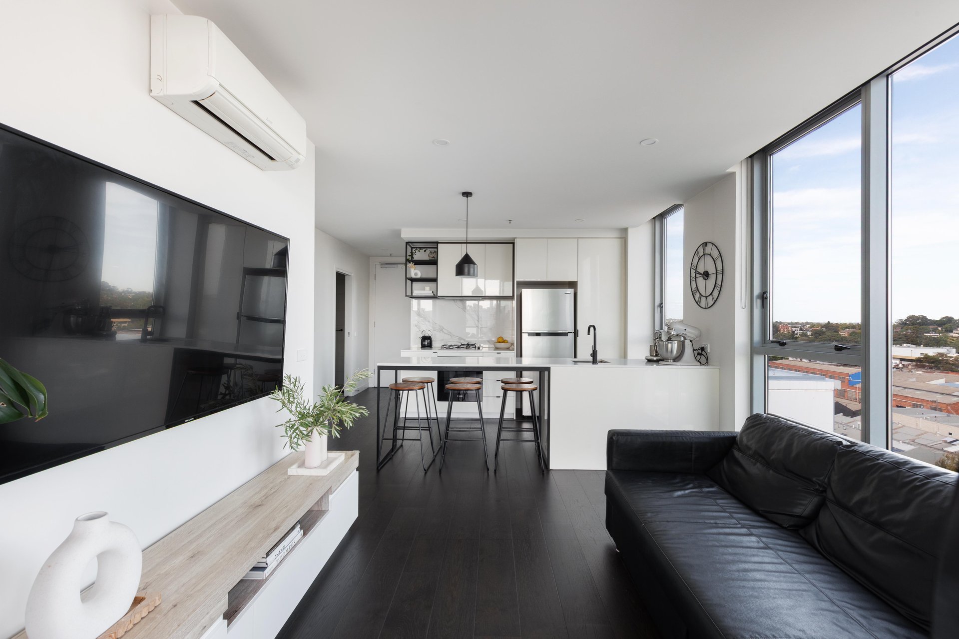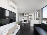 The open-plan living and dining zone is flooded with natural light and flows seamlessly onto a private balcony, creating a space that feels both open and functional — ideal for entertaining or unwinding above Richmond.