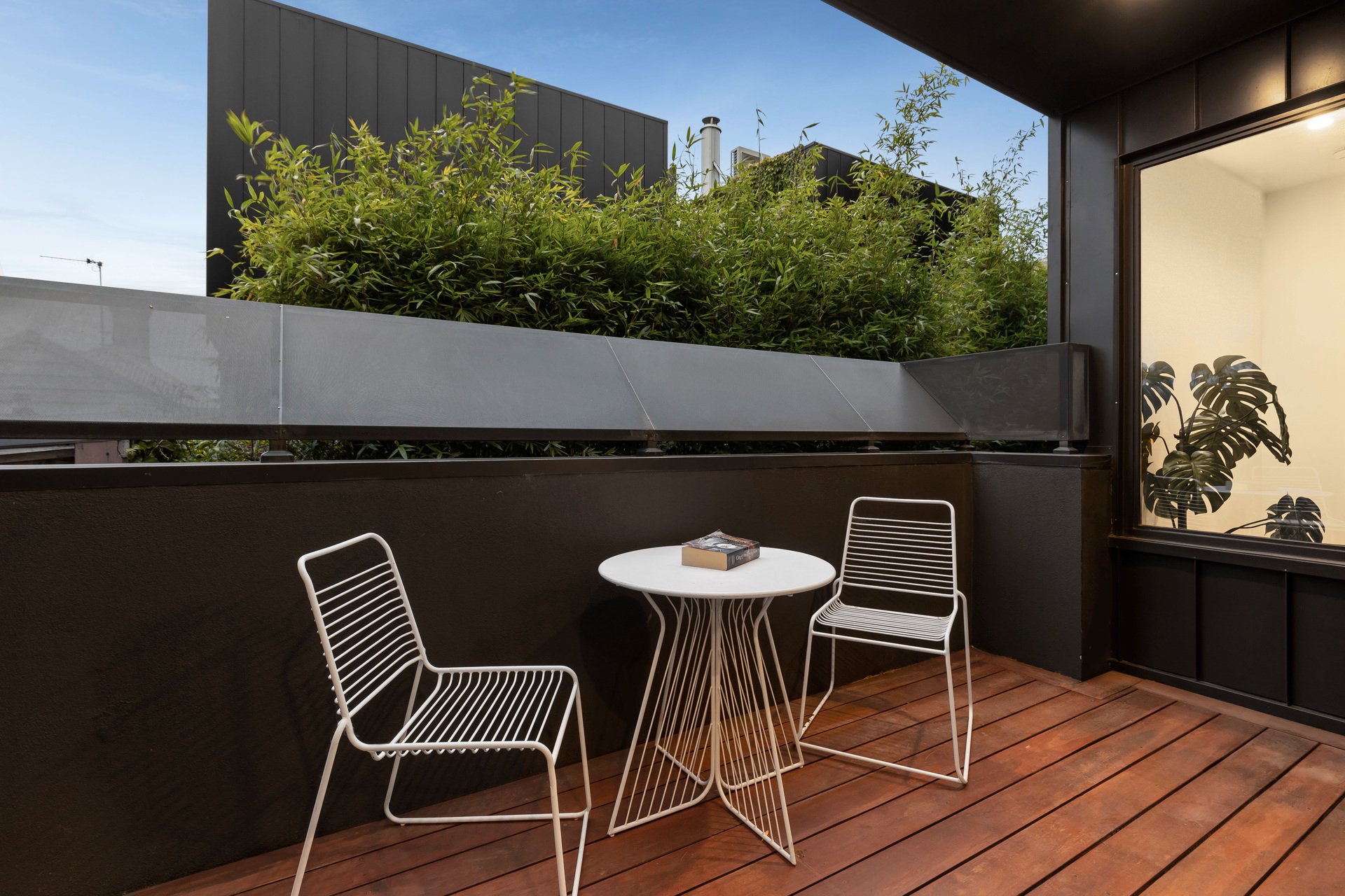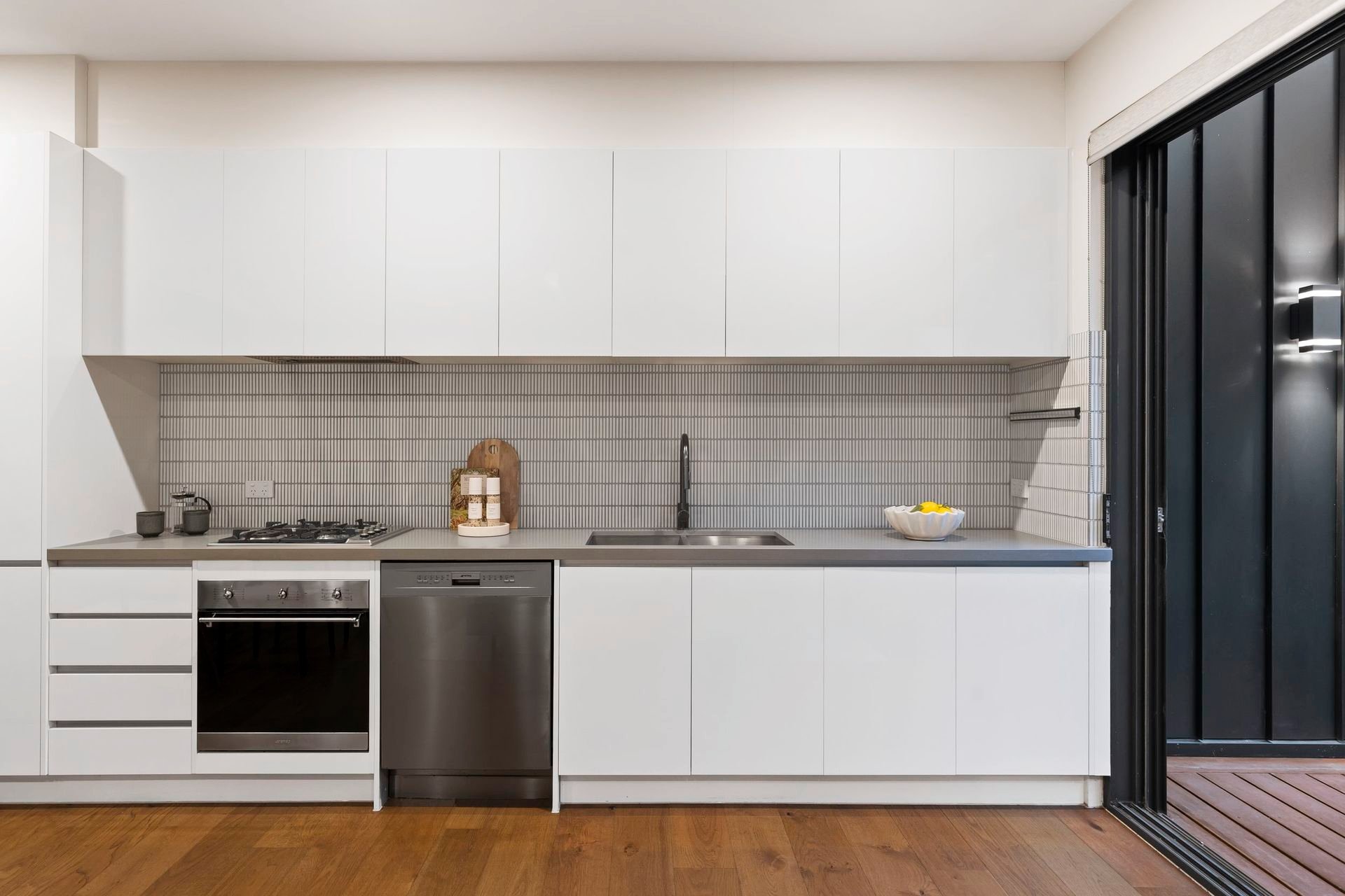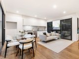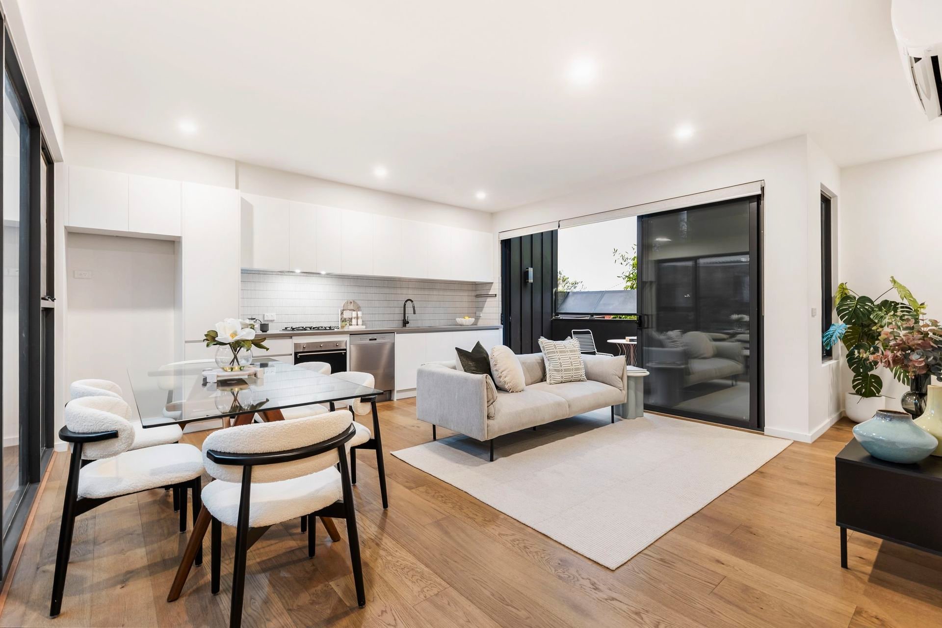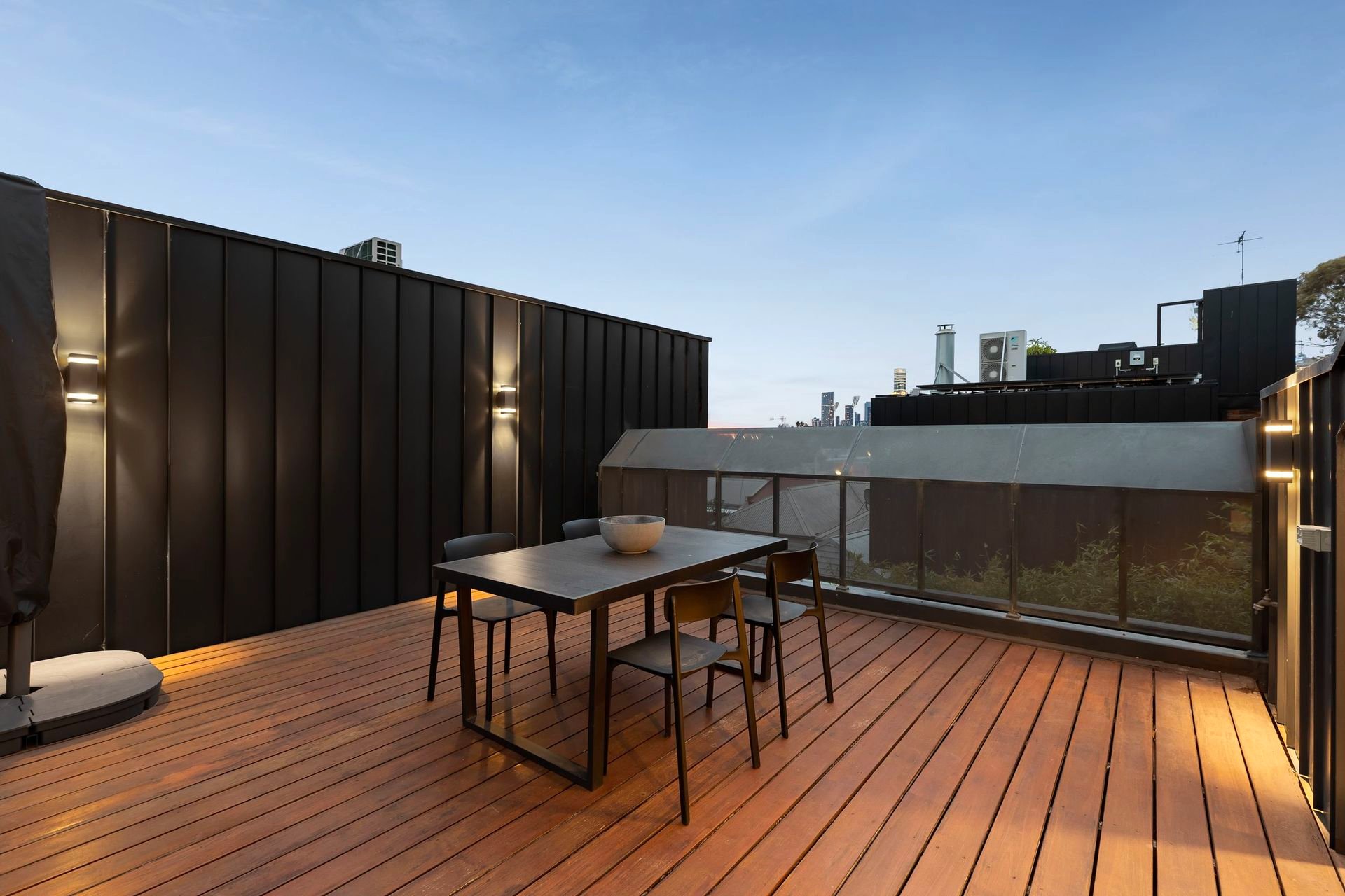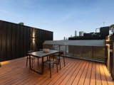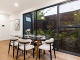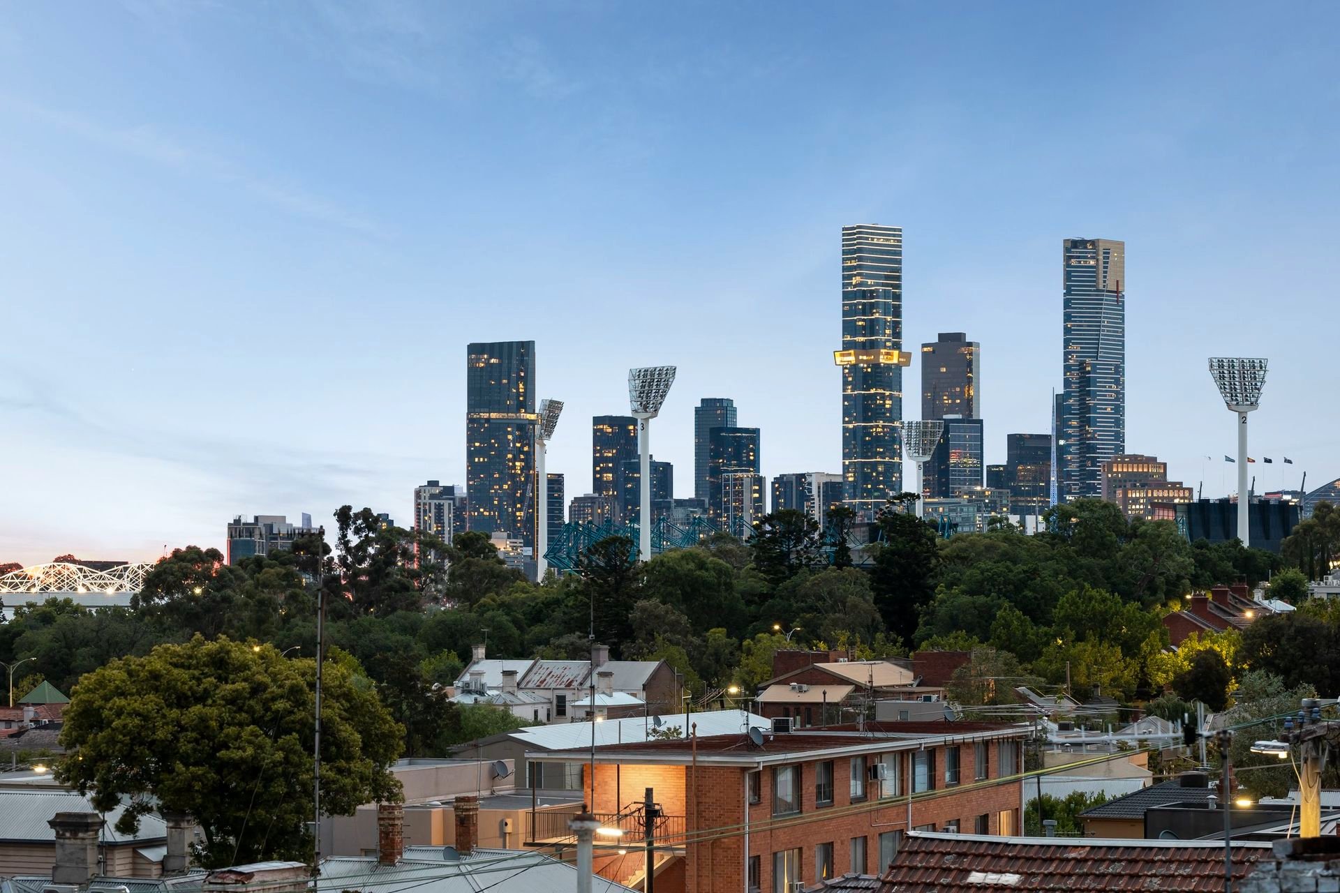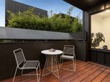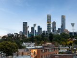 Upstairs, walls of glass capture uninterrupted views of the CBD and MCG from the light-filled open-plan living and dining area, anchored by a sleek Smeg-appointed kitchen. A sizeable balcony extends the living zone outdoors, perfect for a quiet drink at dusk, while the rooftop terrace with panoramic skyline views sets the scene for unforgettable entertaining.