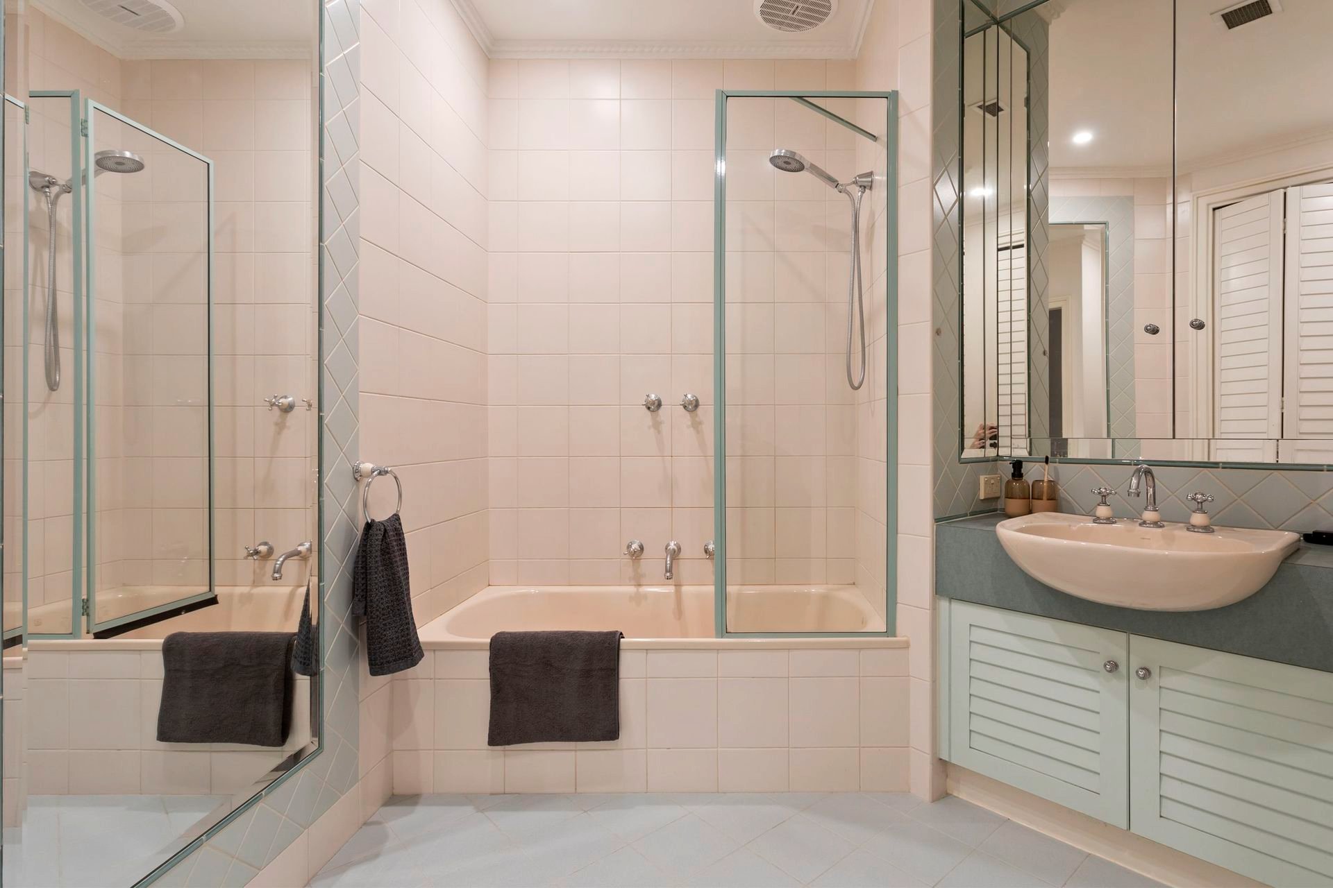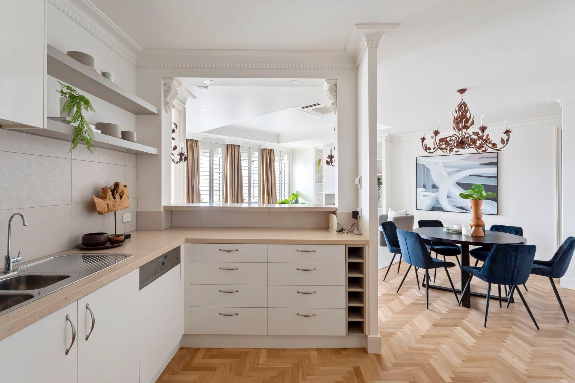The herringbone parquetry, plantation shutters & sheer size of the living and dining room will convince you that the time you have taken out of your day was well worth it to inspect. When you take a closer look, you will see all the little details that set this one apart. The chandelier above the dining area & wall sconces have a natural and fanciful quality, matching a theme of warm comfortable finishes. The kitchen is open enough for modern lifestyles and closed off enough to hide the dishes when entertaining. It has all the finishes you would expect of a Toorak address, with natural stone bench top & thoughtfully designed cabinetry with storage in all the right places, & some surprise features I'll leave for you to find.