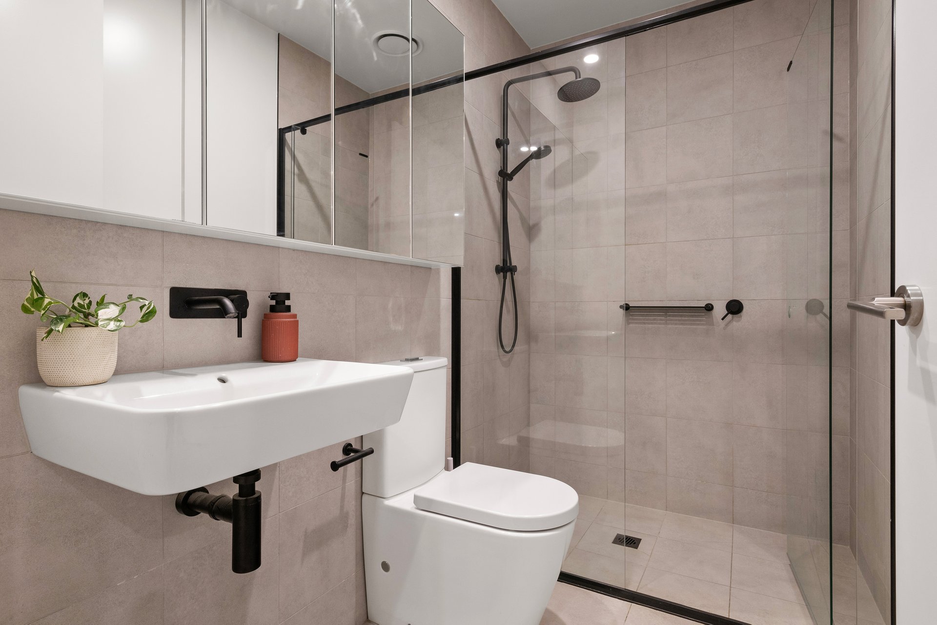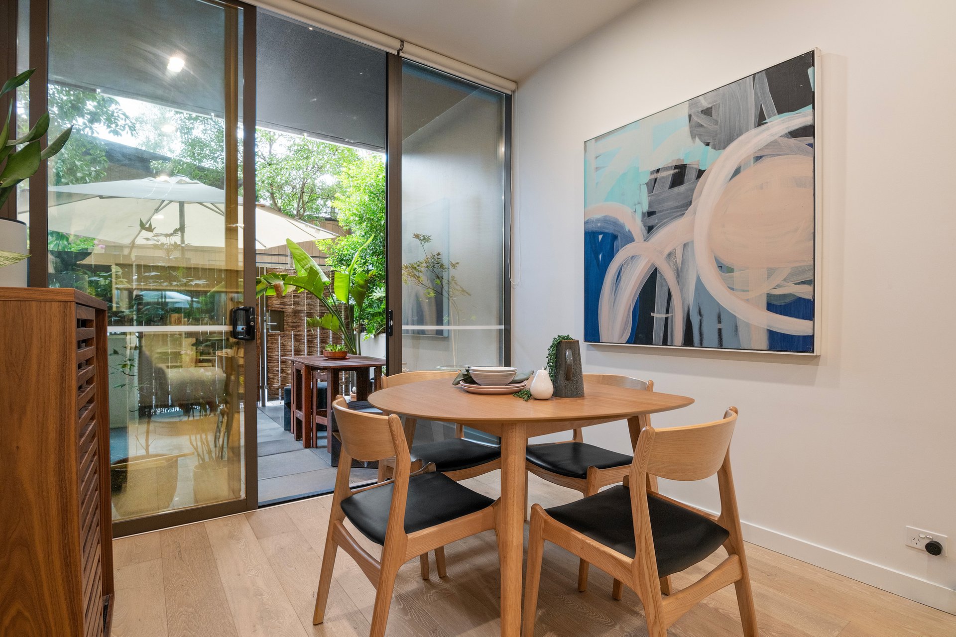 Magically backdropped by the Mullum Mullum Creek Trail, the building embraces its surrounds, with lush foliage and productive edible gardens lining a private walkway with double access. Three full-length double-glazed doors open directly to the apartment’s north-facing courtyard entrance, creating a beautiful indoor-outdoor connection. One leads from the spacious open plan living and dining room, enhanced by soaring ceilings, chic hybrid flooring and a quality kitchen equipped with Bosch appliances, generous storage and stone benchtops. The remaining doors open from the two carpeted bedrooms, each fitted with sliding mirrored wardrobes and serviced by a sleek, fully tiled bathroom.