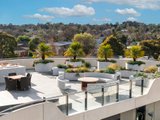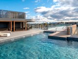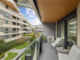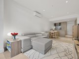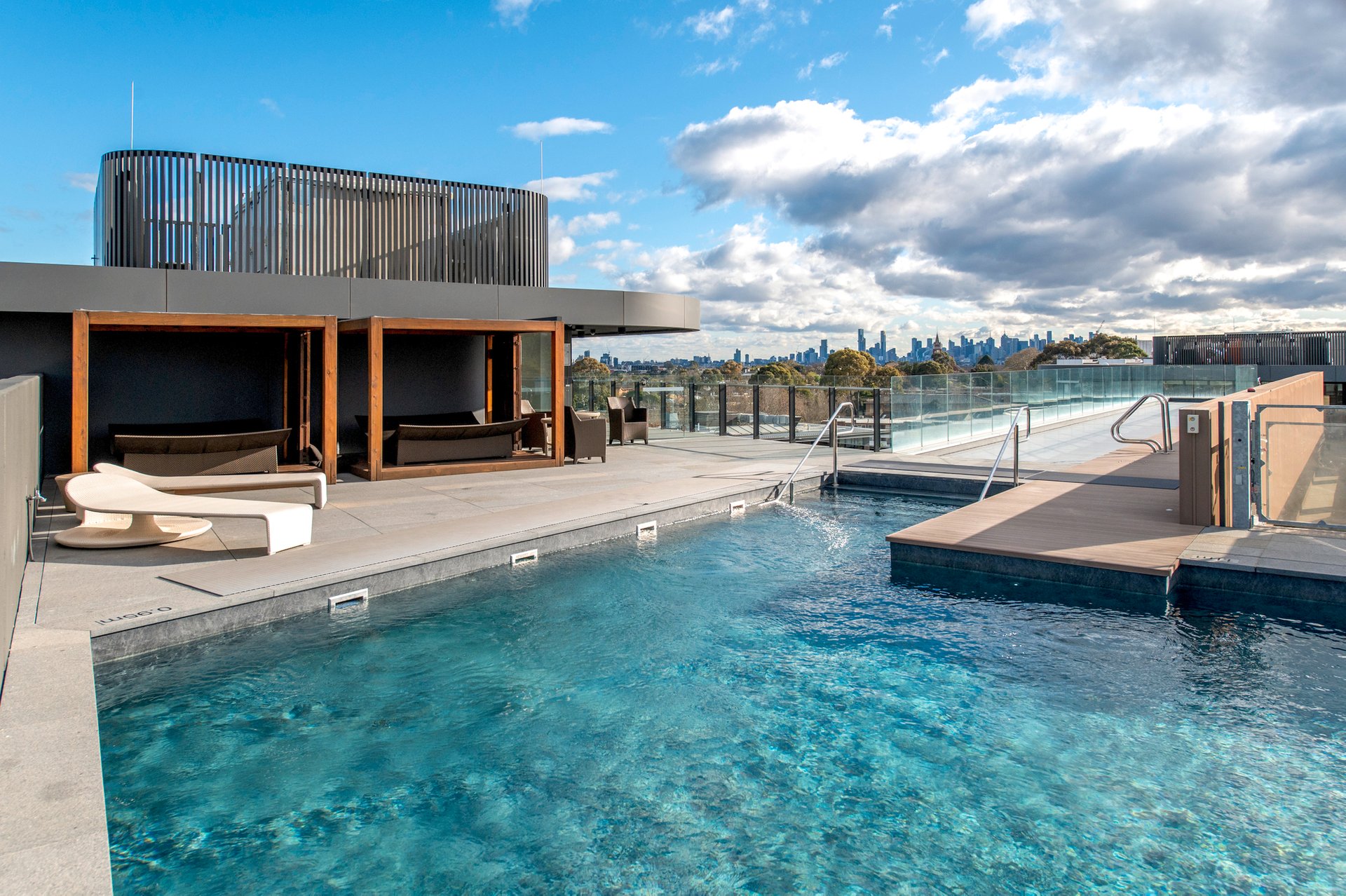 The living and dining zone is generous and open, flowing to a covered terrace. Look up and you'll discover something extraordinary: the rooftop sky pool's glass bottom floating overhead. Few Melbourne buildings can claim a pool like this, and even fewer let you enjoy it from your own balcony.