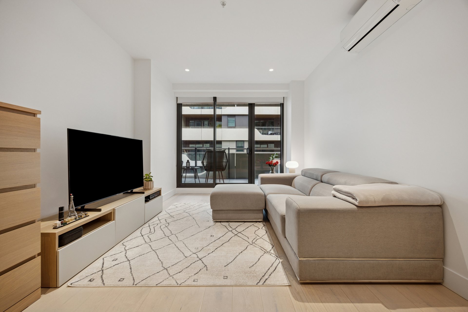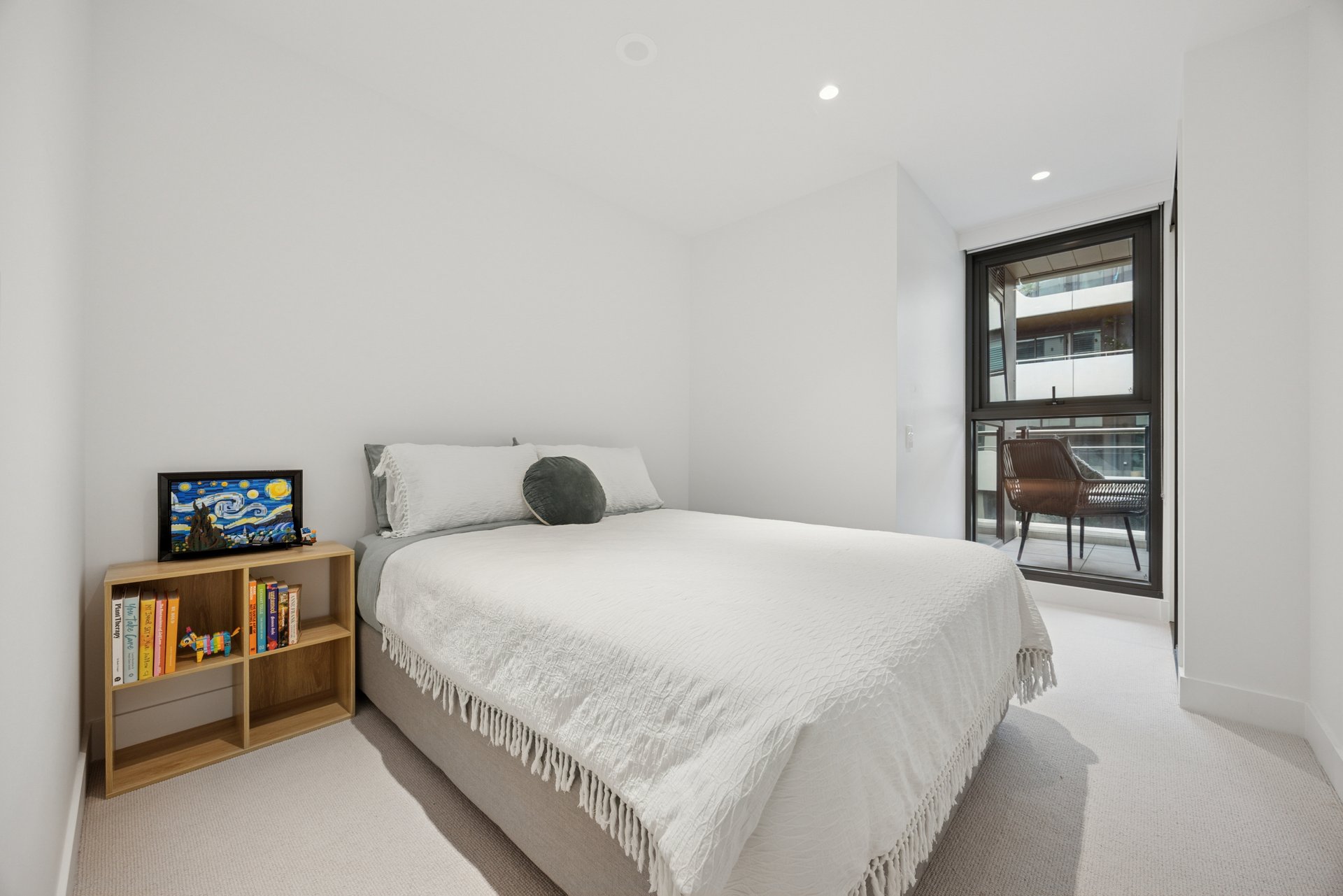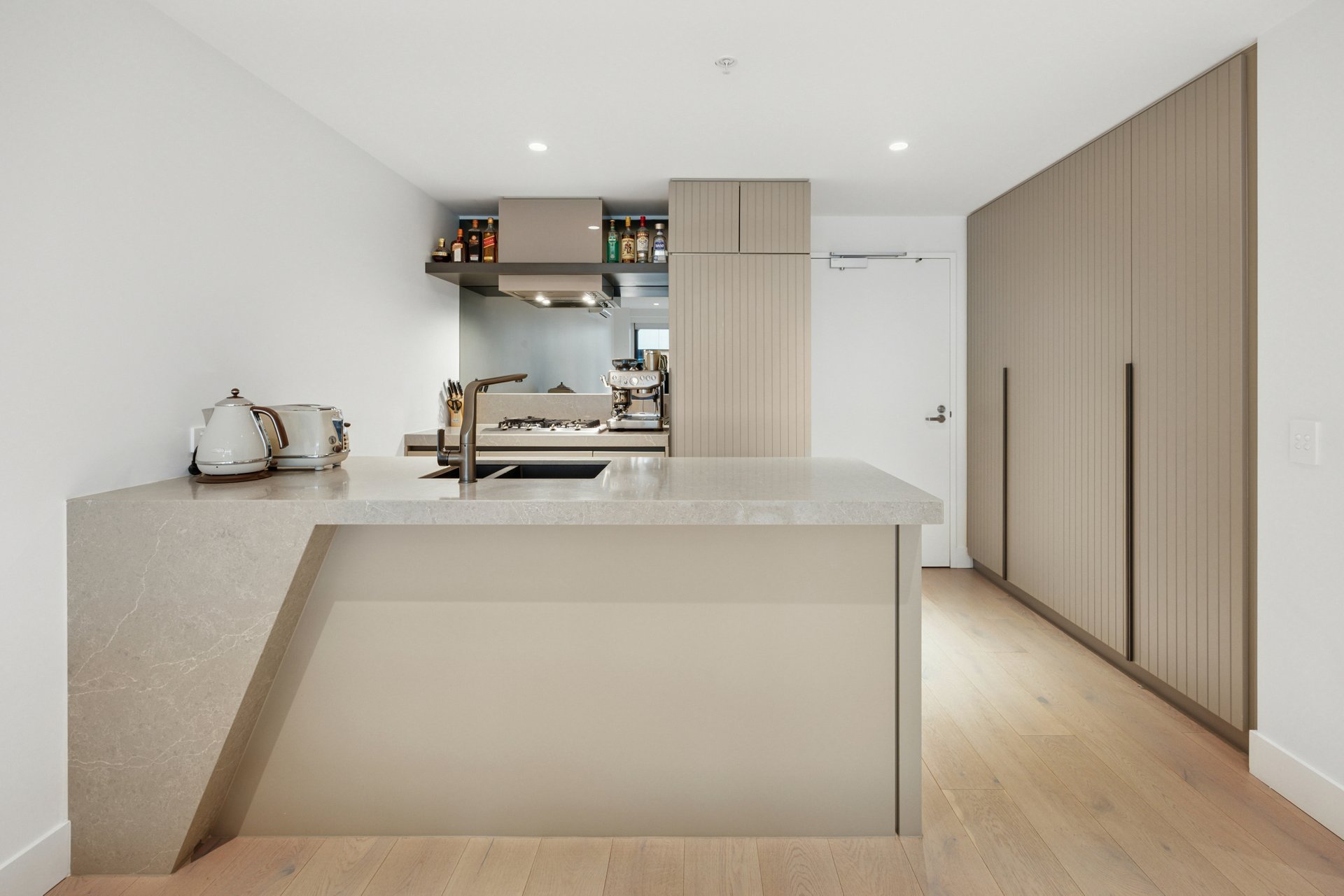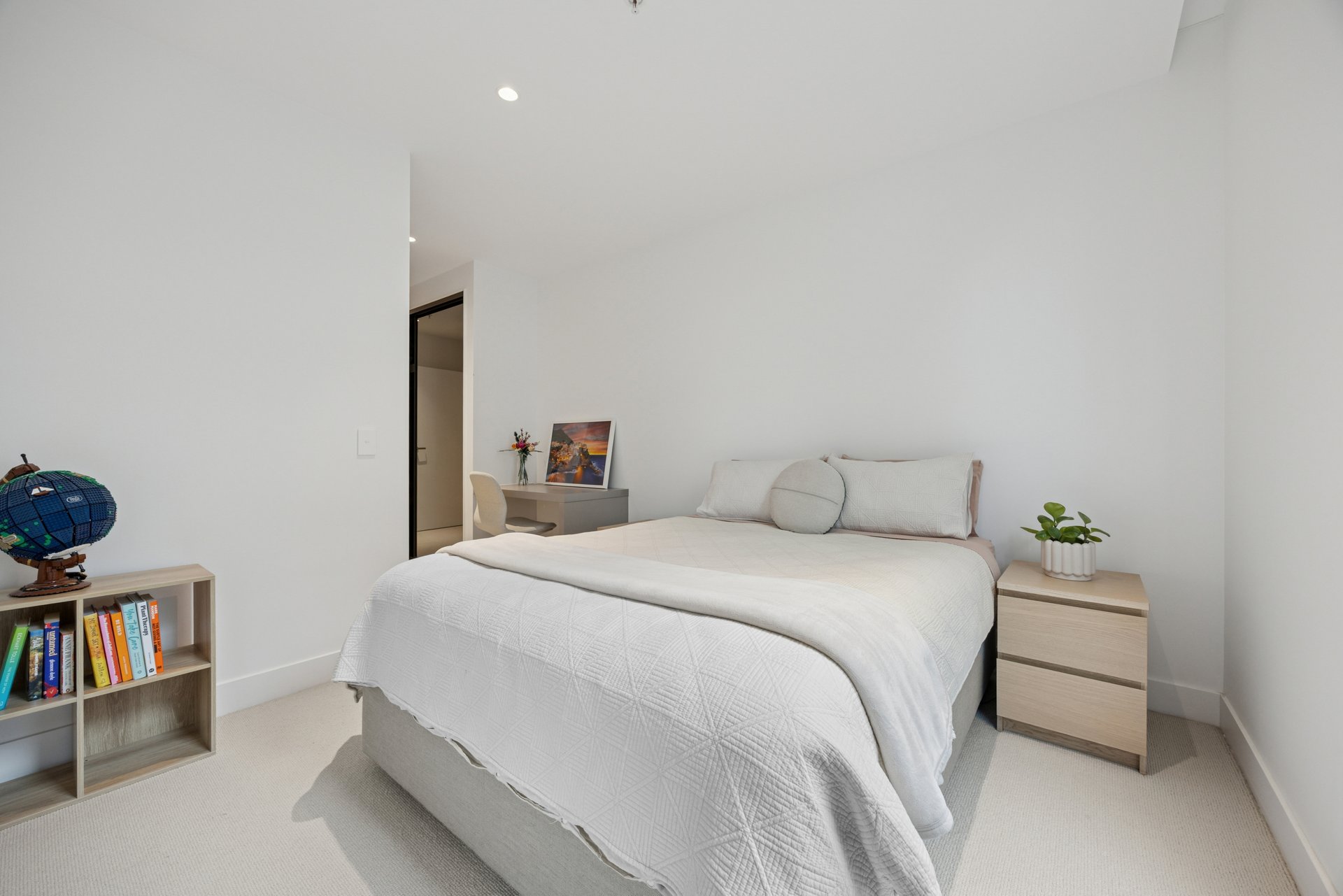 The kitchen is sleek with stone finishes, integrated dishwasher, provision for a concealed fridge, breakfast bar and good storage. Two bedrooms give you choice, the main with an ensuite and a fitted desk for those work-from-home days that need focus. The second bedroom sits near another bathroom. Add split-system heating and cooling, a European laundry, built-in bedroom robes, video-monitored security, secure basement parking, and a storage cage on the same level, and the details are complete.